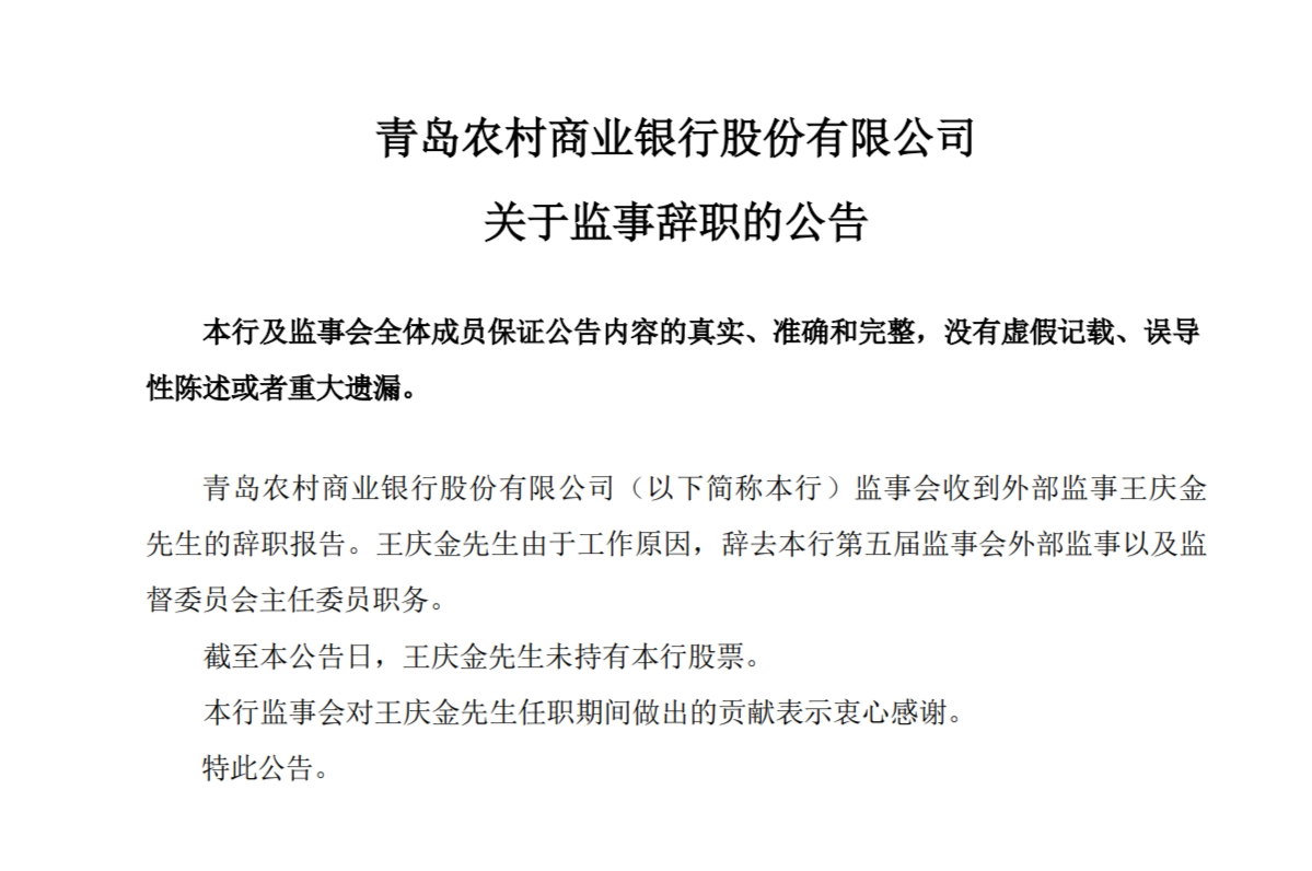 8月1日券商按月配资,青农商行发布公告称,公司监事会收到外部监事王庆金的辞职报告。王庆金由于工作原因,辞去该行第五届监事会外部监事以及监督委员会主任委员职务。截至本公告日,王庆金未持有该行股票。